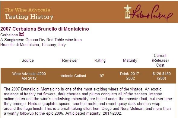 2007 年份在所有 Montalcino 200多家酒莊裡 Cerbaiona 榮獲 Parker 高分 97分
