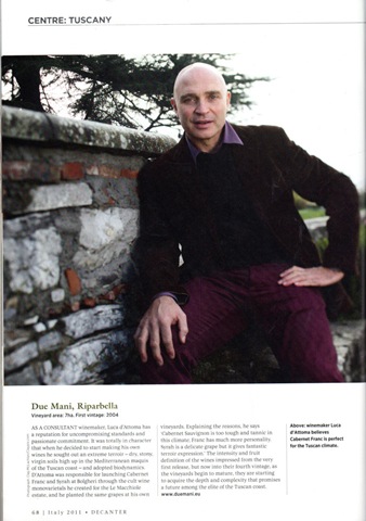Duemani 酒莊是義大利釀酒大師 Luca d’Attoma 所開創的一個另一生涯高峰。Luca 起先在 Tuscany 地區擔任多家酒莊的釀酒顧問,在他的專業努力下這些酒莊紛紛成為世界第一流的超級巨星酒莊,包括 Tua Rita 和 Le Macchiole ,並在這兩家酒莊中分別釀出了100% Merlot ( 和 Masseto 一樣),並兩度獲得 Wine Spectator 100分最高榮譽的完美評價,能獲此殊榮者望眼全世界應該是鳳毛麟角了。這兩款酒為: