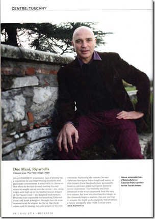Redemp1tion – that must be one of the principal themes running through Luca D’Attoma’s mind these days. One of Italy’s superstar consulting oenologists, D’Attoma helped launch many wineries that went on to become superstars. But his uncompromising ways and the strict demands on quality he placed on winery owners weren’t to everyone’s liking, so over the years D’Attoma’s client list dwindled. In the meantime, D’Attoma and his partner Elena Celli launched their own winery and started making notable wines of their own. Now after several years, many of the original clients are back and D’Attoma is at the top of his game. At Duemani, the vineyards are certified biodynamic and winemaking is stripped down to the bare essentials, with cement taking on an increasing role as a fermentation and aging vessel. This year D’Attoma and Celli have a new wine, CiFRA (100% Cabernet Franc) that is off the charts.